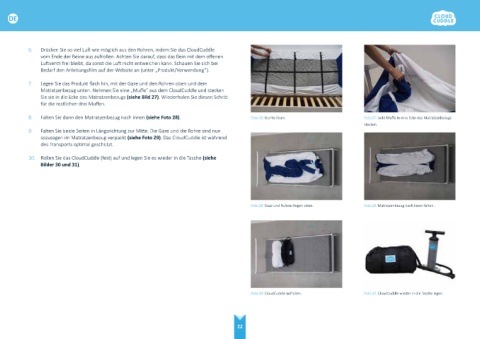 Foto 30: CloudCuddle aufrollen. Foto 31: CloudCuddle wieder in die Tasche legen. Muffe befindet sich ein Loch für das Ventil.