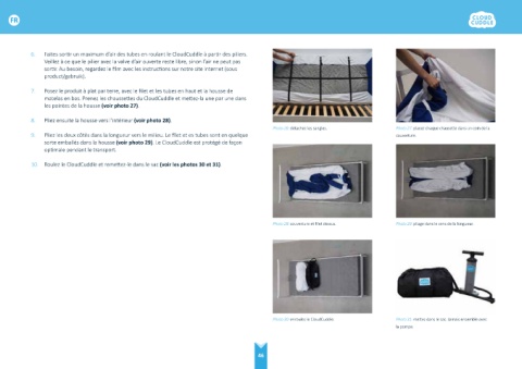 10. Roulez le CloudCuddle et remettez-le dans le sac (voir les photos 30 et 31). • Assurez-vous que le CloudCuddle a un peu de marge dans les coins en le faisant glisser
