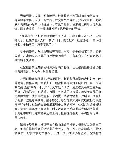 野猪强壮,皮厚,长有獠牙。杜强是第一次面对如此庞然大物,