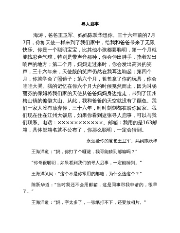 海涛,爸爸王卫军、妈妈陈跃华想你。三十六年前的7月