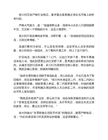 侯大利做出“肖霄和施文强联手作案”的预设后,拨通严峰电话,