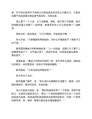 举杯之时,陈浩荡道:“今天只喝酒,不能谈案子啊。”