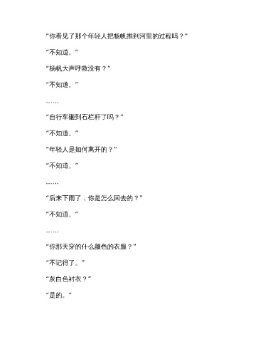 “你看见了那个年轻人把杨帆推到河里的过程吗?” “不知道。” “杨帆大声呼救没有?” “不知道。” …… “自行车砸到石栏杆了吗?” “不知道。” “年轻人是如何离开的?” “不知道。” …… “后来下雨了,你是怎么回去的?” “不知道。” …… “你那天穿的什么颜色的衣服?” “不记得了。” “灰白色衬衣?” “是的。”