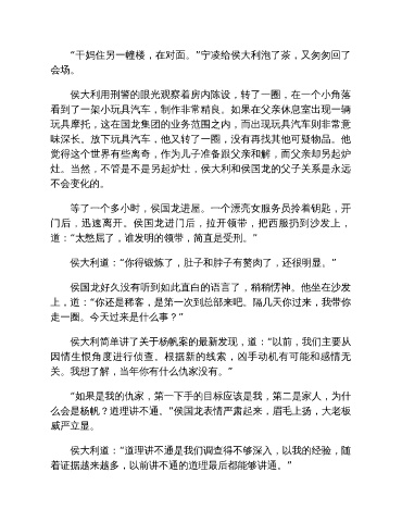 门后,迅速离开。侯国龙进门后,拉开领带,把西服扔到沙发上,