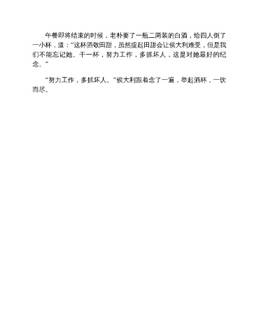 午餐即将结束的时候,老朴要了一瓶二两装的白酒,给四人倒了 一小杯,道:“这杯酒敬田甜,虽然提起田甜会让侯大利难受,但是我 们不能忘记她。干一杯,努力工作,多抓坏人,这是对她最好的纪 念。” “努力工作,多抓坏人。”侯大利跟着念了一遍,举起酒杯,一饮 而尽。