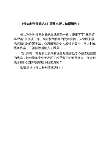 《侯大利刑侦笔记5》即将出版,精彩预告: 侯大利刚刚摸索到杨帆案线索的一角,便接下了“麻将馆 碎尸案”的侦破工作。面对极为特殊的死者身份,从警以来最 恶劣残忍的作案手法,心思缜密到令人发指的凶手,侯大利在 逐条线索一一被排除后陷入了困局…… 与此同时,常务副组长朱林退休后便开始专心追查杨帆案 的线索,抽丝剥茧中终于发现了凶手留下的蛛丝马迹。侯大利 能否在师父朱林的帮助下找出真凶? 敬请期待《侯大利刑侦笔记5》!