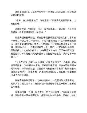 钱,递到孙子手上。许海走进卧室,关上房门。段家秀听到反锁声,