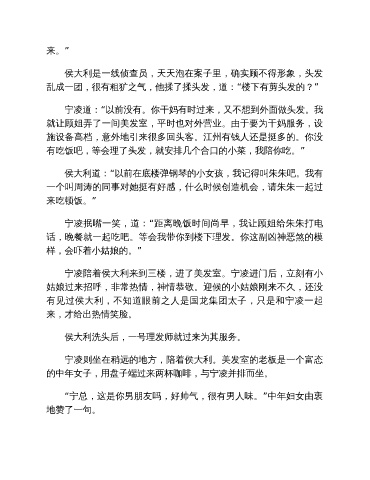 宁凌则坐在稍远的地方,陪着侯大利。美发室的老板是一个富态