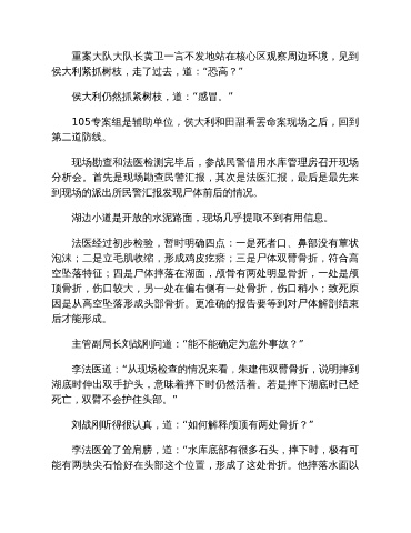 空坠落特征;四是尸体摔落在湖面,颅骨有两处明显骨折,一处是颅