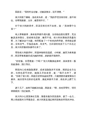 侯大利小心翼翼伸出五指,隔着衣服为田甜挠痒。挠了一会儿,
