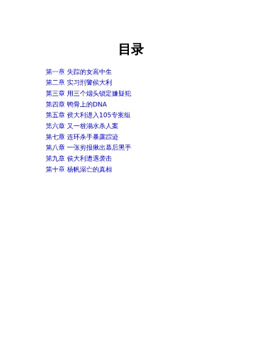 目录 第一章 失踪的女高中生 第二章 实习刑警侯大利 第三章 用三个烟头锁定嫌疑犯 第四章 鸭骨上的DNA 第五章 侯大利进入105专案组 第六章 又一桩溺水杀人案 第七章 连环杀手暴露踪迹 第八章 一张剪报揪出幕后黑手 第九章 侯大利遭遇袭击 第十章 杨帆溺亡的真相
