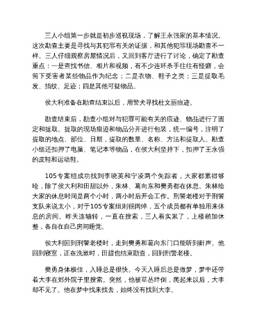 样。三人仔细观察房屋情况后,又回到客厅进行了讨论,确定了勘查