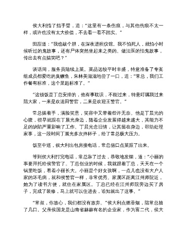 饭至中巡,侯大利出包房接电话,常总借口点菜跟了出来。