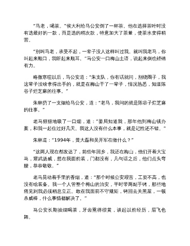 “马老,喝茶。”侯大利给马公安倒了一杯茶。他在选择茶叶时没