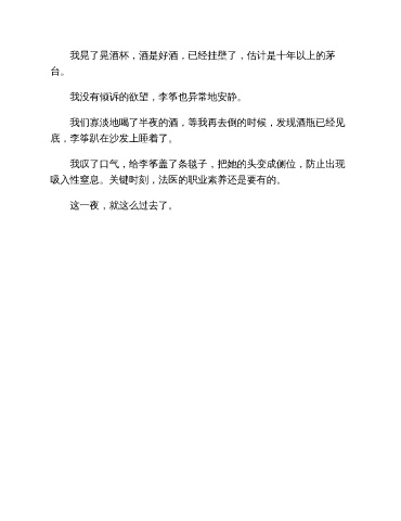我晃了晃酒杯,酒是好酒,已经挂壁了,估计是十年以上的茅 台。 我没有倾诉的欲望,李筝也异常地安静。 我们寡淡地喝了半夜的酒,等我再去倒的时候,发现酒瓶已经见 底,李筝趴在沙发上睡着了。 我叹了口气,给李筝盖了条毯子,把她的头变成侧位,防止出现 吸入性窒息。关键时刻,法医的职业素养还是要有的。 这一夜,就这么过去了。