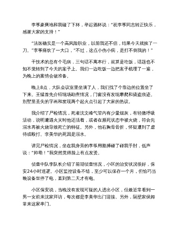 讲完尸检情况,坐在我身旁的李筝用胳膊碰了碰我手肘,低声