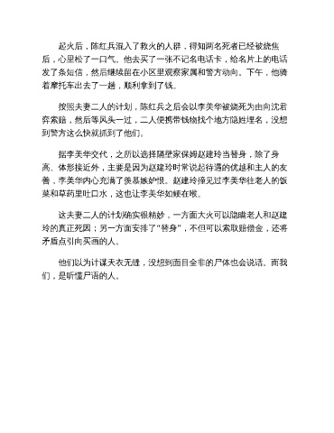 按照夫妻二人的计划,陈红兵之后会以李美华被烧死为由向沈君