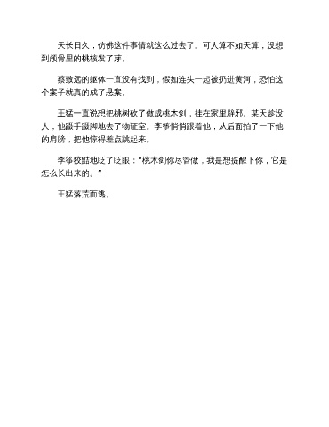 天长日久,仿佛这件事情就这么过去了。可人算不如天算,没想 到颅骨里的桃核发了芽。 蔡致远的躯体一直没有找到,假如连头一起被扔进黄河,恐怕这 个案子就真的成了悬案。 王猛一直说想把桃树砍了做成桃木剑,挂在家里辟邪。某天趁没 人,他蹑手蹑脚地去了物证室。李筝悄悄跟着他,从后面拍了一下他 的肩膀,把他惊得差点跳起来。 李筝狡黠地眨了眨眼:“桃木剑你尽管做,我是想提醒下你,它是 怎么长出来的。” 王猛落荒而逃。