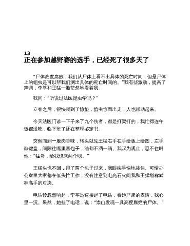里一沉。果然,她挂了电话,说:“崇山发现一具高度腐烂的尸体。”