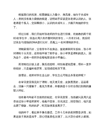 人;房间没有暴力撬锁的痕迹,说明凶手应该是张老师认识的人。张