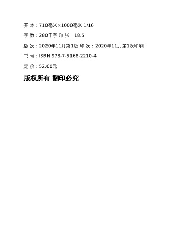开 本:710毫米×1000毫米 1/16 字 数:280千字 印 张:18.5 版 次:2020年11月第1版 印 次:2020年11月第1次印刷 书 号:ISBN 978-7-5168-2210-4 定 价:52.00元 版权所有 翻印必究
