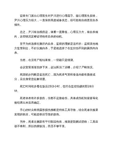 监狱专门派出心理医生对尹川进行心理疏导。据心理医生反映,