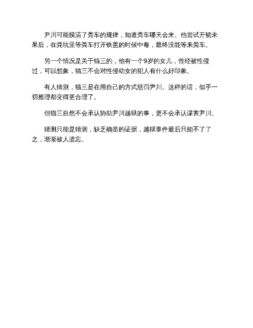 尹川可能摸清了粪车的规律,知道粪车哪天会来。他尝试开锁未 果后,在粪坑里等粪车打开铁盖的时候中毒,最终没能等来粪车。 另一个情况是关于猫三的,他有一个9岁的女儿,曾经被性侵 过,可以想象,猫三不会对性侵幼女的犯人有什么好印象。 有人猜测,猫三是在用自己的方式惩罚尹川。这样的话,似乎一 切推理都变得更合理了。 但猫三自然不会承认协助尹川越狱的事,更不会承认谋害尹川。 猜测只能是猜测,缺乏确凿的证据,越狱事件最后只能不了了 之,渐渐被人遗忘。