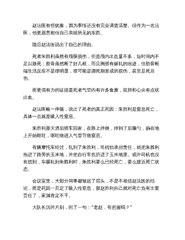 赵法医略一停顿,说出了死者的真正死因:朱胜利是窒息死亡,