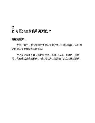 2 如何区分生前伤和死后伤? 法医刘晓辉: 在分尸案中,对所有损伤要进行生前伤或死后伤的判断,而区别 这两者主要看有没有生活反应。 生活反应有很多种,如创缘收缩、出血、结痂、血凝块、炎症 等,具有生活反应的损伤,可以判定为生前损伤,反之为死后损伤。