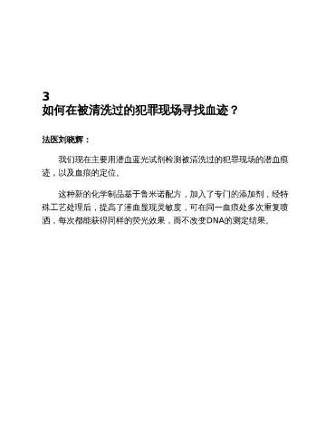 3 如何在被清洗过的犯罪现场寻找血迹? 法医刘晓辉: 我们现在主要用潜血蓝光试剂检测被清洗过的犯罪现场的潜血痕 迹,以及血痕的定位。 这种新的化学制品基于鲁米诺配方,加入了专门的添加剂,经特 殊工艺处理后,提高了潜血显现灵敏度,可在同一血痕处多次重复喷 洒,每次都能获得同样的荧光效果,而不改变DNA的测定结果。