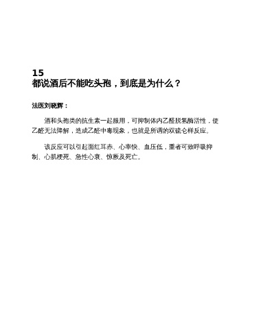 15 都说酒后不能吃头孢,到底是为什么? 法医刘晓辉: 酒和头孢类的抗生素一起服用,可抑制体内乙醛脱氢酶活性,使 乙醛无法降解,造成乙醛中毒现象,也就是所谓的双硫仑样反应。 该反应可以引起面红耳赤、心率快、血压低,重者可致呼吸抑 制、心肌梗死、急性心衰、惊厥及死亡。