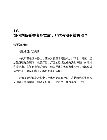 16 如何判断受害者死亡后,尸体有没有被移动? 法医刘晓辉: 可以通过尸斑判断。 人死后血液循环停止,血液沿着血管网坠积于尸体低下部位,皮 肤呈现暗红色斑痕,就是尸斑。尸斑的形成过程分为坠积期、扩散期 和浸润期。在坠积期和扩散期,假如尸体的体位发生变动,可以形成 新的尸斑,这是判断有无移尸的重要依据。 比如在保鲜膜裹尸案中,尸体两侧都有尸斑,这是因为凶手后来 又回到受害者房间,翻动了尸体,于是在另一侧也形成了尸斑。