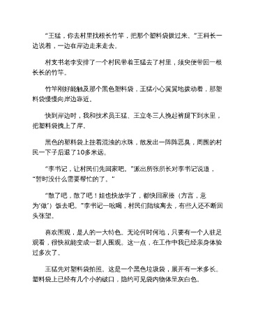 “王猛,你去村里找根长竹竿,把那个塑料袋拨过来。”王科长一