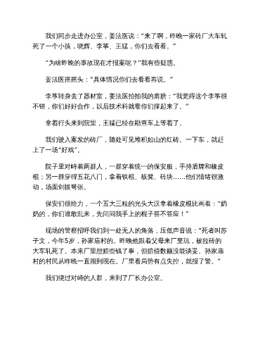 我们同步走进办公室,姜法医说:“来了啊,昨晚一家砖厂大车轧