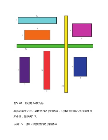 图5.20 面积是24的矩形 与其让学生记住不同性质四边形的名称,不如让他们自己去根据性质 来命名,如示例5.5。 示例5.5 说出不同类型四边形的名称