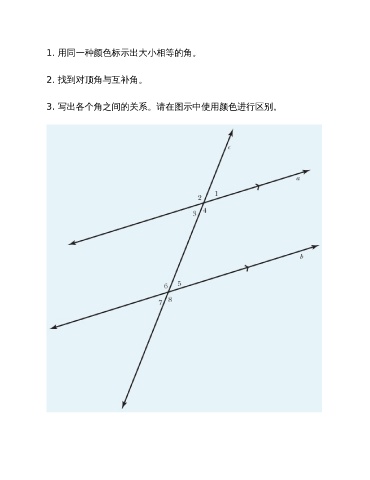 1. 用同一种颜色标示出大小相等的角。 2. 找到对顶角与互补角。 3. 写出各个角之间的关系。请在图示中使用颜色进行区别。