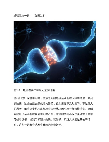 域联系在一起。(如图1.1) 图1.1 电流在两个神经元之间传递 当我们进行深度学习时,突触之间的电流运动会在大脑中形成一系列 的连接,这些连接会形成结构路径,但如果你不及时复习、不做深入 的思考,那么这个结构路径就会像沙地上的小路一样很快消失。突触 间的电流运动会在我们学习时产生,这里的学习不仅仅是课堂上的学 习或者读书,当我们和别人交谈、玩游戏、玩玩具或者做其他事情 时,这些行为都会诱发突触间的电流运动。
