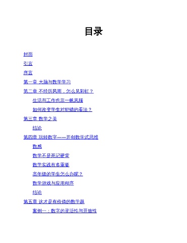 目录 封面 引言 序言 第一章 大脑与数学学习 第二章 不经历风雨,怎么见彩虹? 生活与工作也非一帆风顺 如何改变学生对犯错的看法? 第三章 数学之美 结论 第四章 玩转数字——开创数学式思维 数感 数学不是死记硬背 数学实践有多重要 高年级的学生怎么办呢? 数学游戏与应用程序 结论 第五章 这才是有价值的数学题 案例一:数字的灵活性与开放性