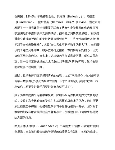 在美国,85%的小学教师是女性。贝洛克(Beilock,)、冈德森