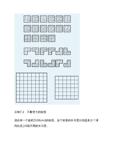 示例7.2 不断变大的矩形 现在有一个面积为20cm2的矩形。这个矩形的长与宽分别是多少?请 列出至少5组不同的长与宽。