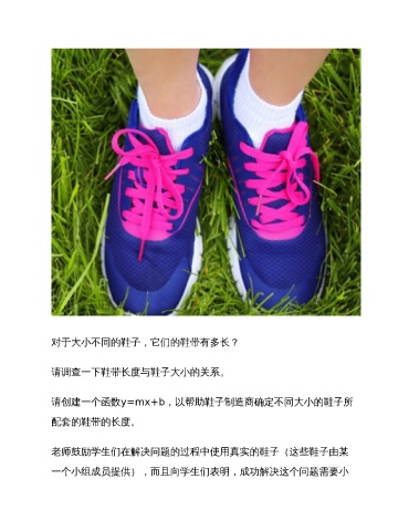 对于大小不同的鞋子,它们的鞋带有多长? 请调查一下鞋带长度与鞋子大小的关系。 请创建一个函数y=mx+b,以帮助鞋子制造商确定不同大小的鞋子所 配套的鞋带的长度。 老师鼓励学生们在解决问题的过程中使用真实的鞋子(这些鞋子由某 一个小组成员提供),而且向学生们表明,成功解决这个问题需要小