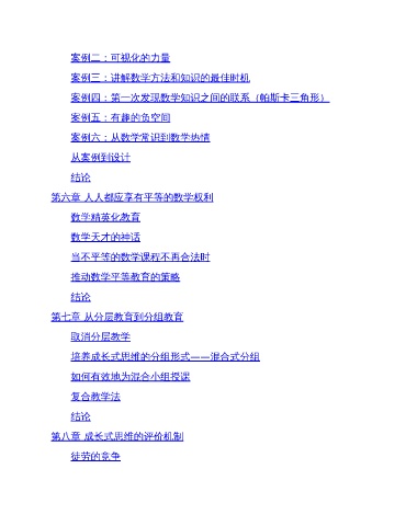 案例二:可视化的力量 案例三:讲解数学方法和知识的最佳时机 案例四:第一次发现数学知识之间的联系(帕斯卡三角形) 案例五:有趣的负空间 案例六:从数学常识到数学热情 从案例到设计 结论 第六章 人人都应享有平等的数学权利 数学精英化教育 数学天才的神话 当不平等的数学课程不再合法时 推动数学平等教育的策略 结论 第七章 从分层教育到分组教育 取消分层教学 培养成长式思维的分组形式——混合式分组 如何有效地为混合小组授课 复合教学法 结论 第八章 成长式思维的评价机制 徒劳的竞争