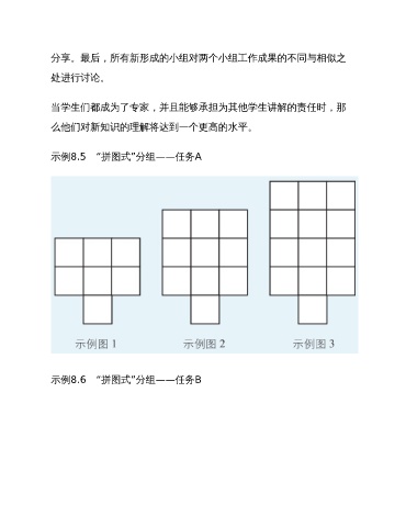 分享。最后,所有新形成的小组对两个小组工作成果的不同与相似之 处进行讨论。 当学生们都成为了专家,并且能够承担为其他学生讲解的责任时,那 么他们对新知识的理解将达到一个更高的水平。 示例8.5 “拼图式”分组——任务A 示例8.6 “拼图式”分组——任务B