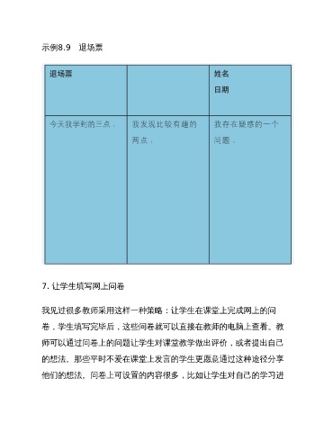 示例8.9 退场票 7. 让学生填写网上问卷 我见过很多教师采用这样一种策略:让学生在课堂上完成网上的问 卷,学生填写完毕后,这些问卷就可以直接在教师的电脑上查看。教 师可以通过问卷上的问题让学生对课堂教学做出评价,或者提出自己 的想法。那些平时不爱在课堂上发言的学生更愿意通过这种途径分享 他们的想法。问卷上可设置的内容很多,比如让学生对自己的学习进