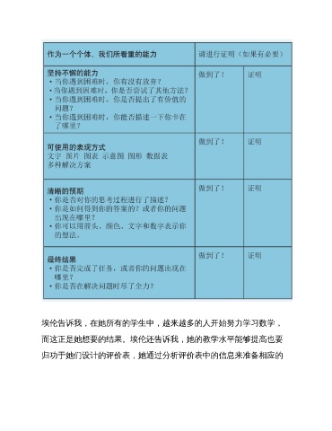 埃伦告诉我,在她所有的学生中,越来越多的人开始努力学习数学, 而这正是她想要的结果。埃伦还告诉我,她的教学水平能够提高也要 归功于她们设计的评价表,她通过分析评价表中的信息来准备相应的