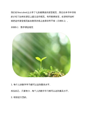 我们在Youcubed上分享了七条最重要的课堂规范,我也在本书中详细 的介绍了如何在课堂上建立这些规范。有些教师发现,在课程开始时 就把这些课堂规范贴在教室的墙上效果非常不错(示例9.1)。 示例9.1 数学课堂规范 1. 每个人的数学学习都可以达到最高水平。 相信自己。只要努力,每个人的数学学习都可以达到最高水平。 2. 错误是宝贵的。
