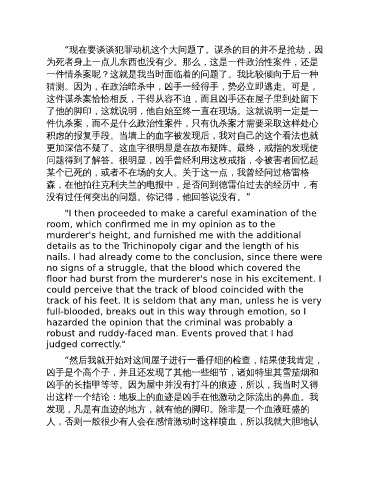 凶手的长指甲等等。因为屋中并没有打斗的痕迹,所以,我当时又得