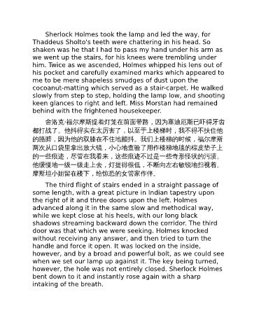 的胳膊,因为他的双膝在不住地颤抖。我们上楼梯的时候,福尔摩斯