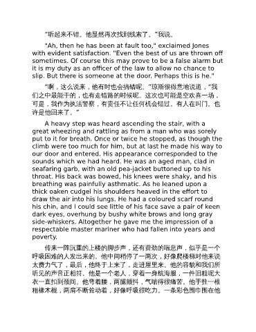 听见的声音正相符。他是一个老人,穿着一身航海服,一件旧粗呢大