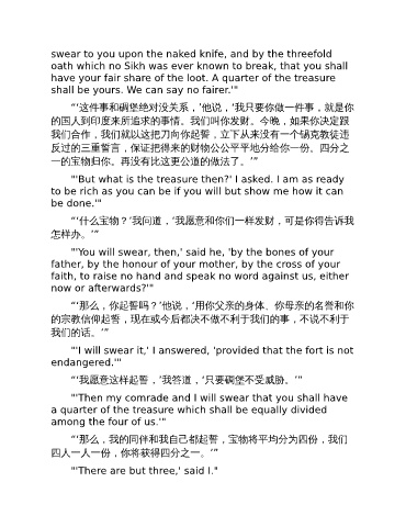 “‘那么,我的同伴和我自己都起誓,宝物将平均分为四份,我们